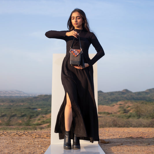 Black Floral Hexbox - Hexagonal Kutchi Handcrafted Bag